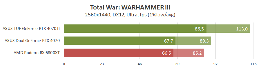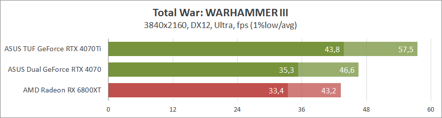 В прошлогодней стратегии можно играть с пресетом максимального качества графики с разрешением 3840х2160, но для новой карты лучше подойдут экраны 2К. Ее быстродействие несколько превышает производительность Radeon RX 6800 XT, но где-то на 25% ниже GeForce RTX 4070 Ti.
