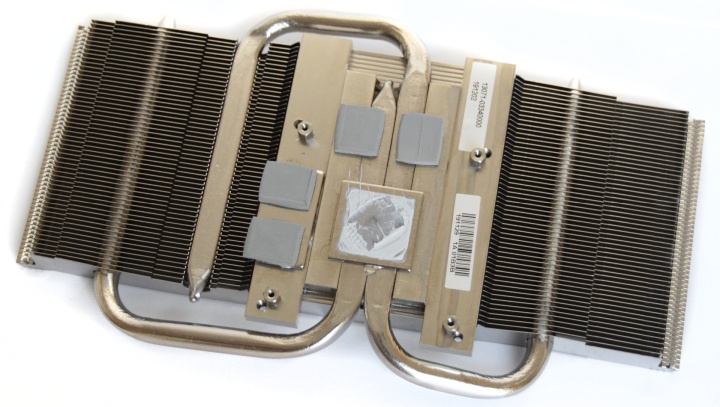 Задействованы две толстые медные тепловые трубки, которые изгибаются и пронизывают пластины радиатора в нескольких точках. Тепловой контакт с графическим чипом осуществляется через небольшую пластину-основание. Все элементы имеют никелированное покрытие.