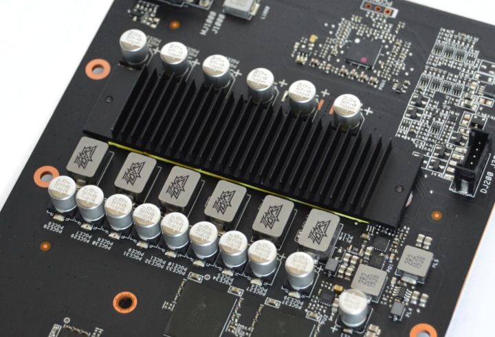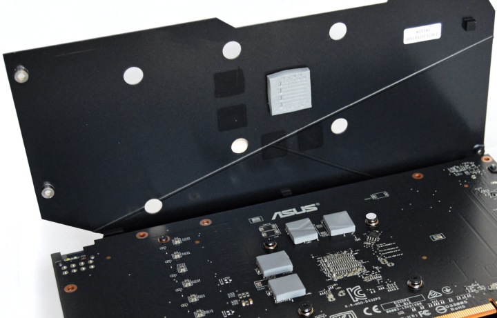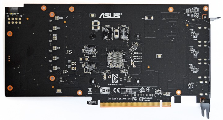 Приятным сюрпризом стало использование усилительной пластины в качестве дополнительного радиатора. Для этого между пластиной и текстолитом предусмотрены термопрокладки в зоне под микросхемами памяти GDDR6 и под чипом GPU.