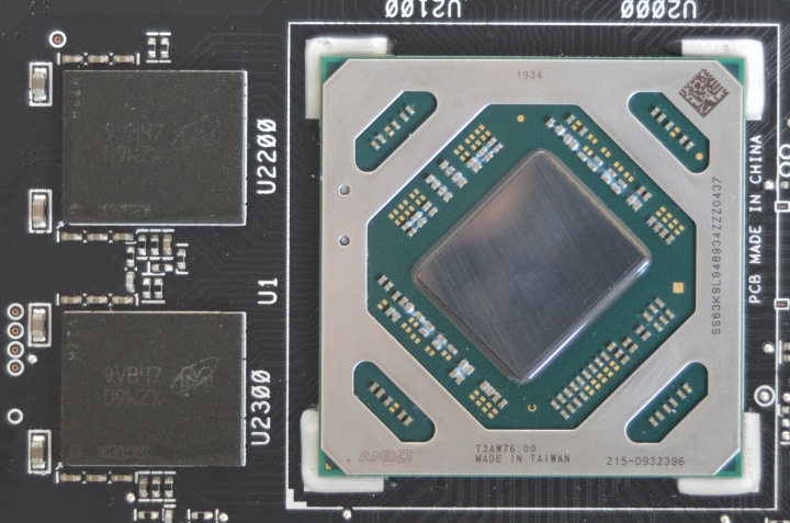 Процессор Navi 14 окружен массивной защитной рамкой. Восемь гигабайт памяти набраны четырьмя микросхемами Micron 9VB47 D9WZX.