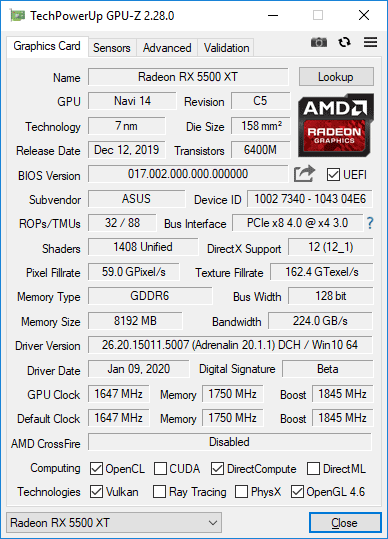 Видеокарты Navi первыми на рынке получили поддержку нового скоростного интерфейса PCI Express 4.0. Но у Radeon RX 5500 XT используется 8 линий вместо 16. А поскольку поддержку нового стандарта PCI Express могут обеспечить только конфигурации на базе процессоров AMD Ryzen последнего поколения, то все обладатели более старых конфигураций или систем на базе Intel могут получить продукт, чей потенциал будет немного ограничен. В случае не самой мощной видеокарты польза от быстрой шины и 16 линий может быть не критична, но стоит учитывать этот нюанс при изучении наших результатов, которые получены на базе системы Intel, где видеокарта работала в режиме PCI-E x8 3.0.