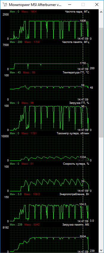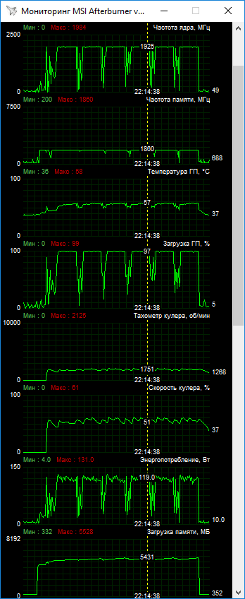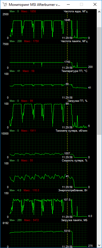 При заданных параметрах частоты Boost приближались к отметке 2 ГГц. Во многих играх рабочий диапазон был 1940–1990 МГц при некоторых просадках в отдельные моменты. Температура 58 °С сохранялась при пиковой скорости вентиляторов до 1700–2000 об/мин. Благодаря плавному изменения скорости общий шум находился в приемлемых рамках.