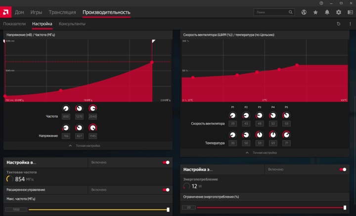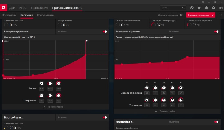 Подводя общие итоги, можно сказать, что видеокарта действительно холодная и тихая. Но если вы хотите немного изменить рабочие параметры, это можно осуществить через меню «Настройки Radeon». Данное приложение традиционно предлагает самые широкие возможности для регулирования частот, напряжений и алгоритма работы вентиляторов системы охлаждения. Через меню настроек производительности можно вручную менять кривые Boost-частот и кривую скорости вентиляторов или корректировать их через фиксированные значения для отдельных точек.