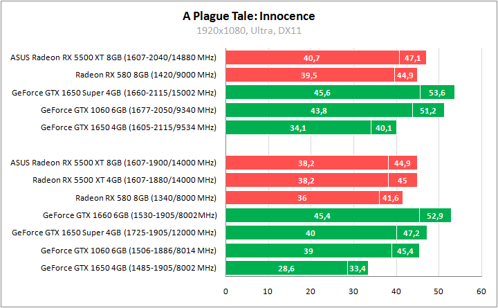 В игре A Plague Tale новый видеоадаптер AMD на 5–8% быстрее Radeon RX 580, почти не уступая GeForce GTX 1060. 4 ГБ тут хватает с лихвой.