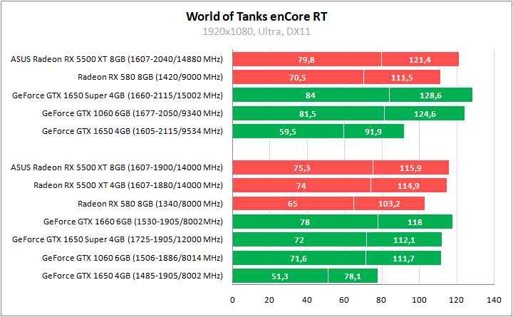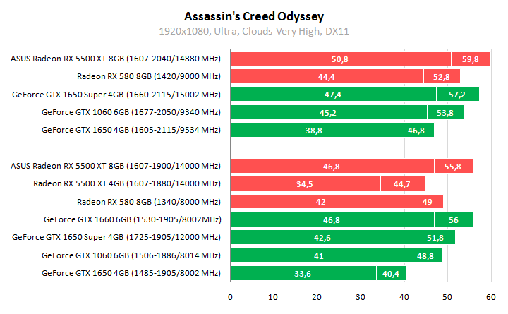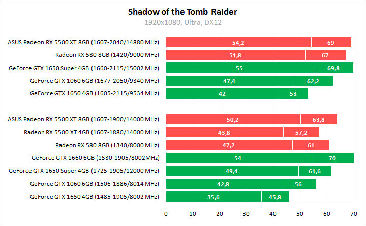 В данном тесте используется уже около 5 ГБ видеопамяти, что сильно подкашивает позиции младшей версии Radeon RX 5500 XT. Зато видеокарта ASUS с 8 ГБ почти не уступает GeForce GTX 1660 и обгоняет этого конкурента после разгона.
