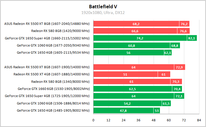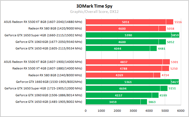 Radeon RX 5500 XT с 4 ГБ уступает Radeon RX 580 с 8 ГБ, но ASUS уже быстрее. Есть небольшое преимущество над GeForce GTX 1650 Super, а после разгона итоговые показатели почти не отличаются от производительности GeForce GTX 1660 в номинале.