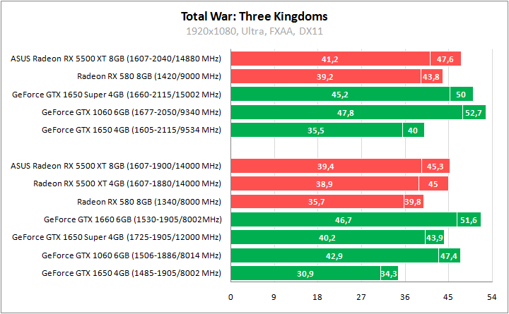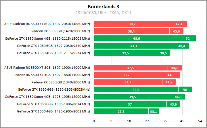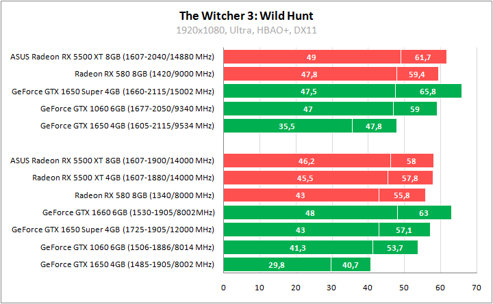 Очень требовательная игра, что хорошо видно из нашего отдельного тестирования. Полноценный Radeon RX 5500 XT от ASUS быстрее Radeon RX 580 и сопоставим с GeForce GTX 1650 Super. Ускорение от разгона 5%.