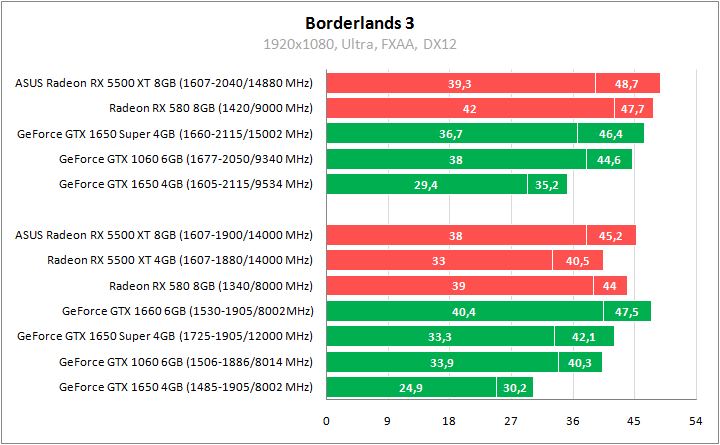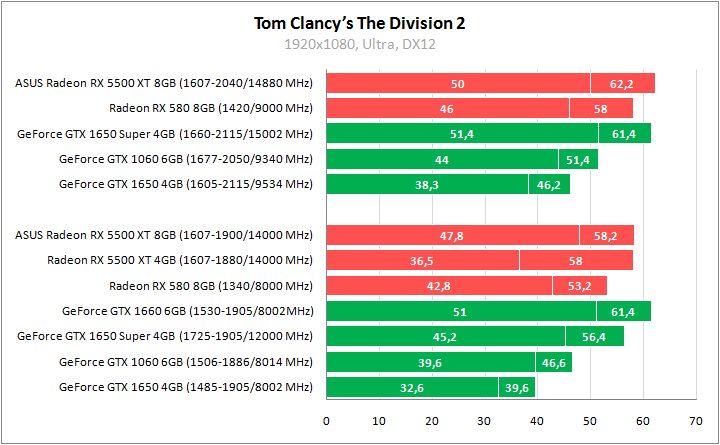 При одинаковом среднем fps в The Division 2 заметна серьезная разница в минимальном показателе на версиях с разным объемом памяти. ASUS DUAL-RX5500XT-O8G-EVO выигрывает у Radeon RX 580 и GeForce GTX 1650 Super, в разгоне нагоняя GeForce GTX 1660.