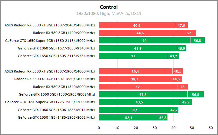 При выборе простого варианта MSAA игре Control в DirectX 11 вполне хватает 4 ГБ, поэтому разница между двумя вариантами Radeon RX 5500 XT объясняется небольшой разницей в частотах Game Clock. Рассматриваемый ASUS быстрее GeForce GTX 1060, но слабее GeForce GTX 1650 Super и Radeon RX 580.