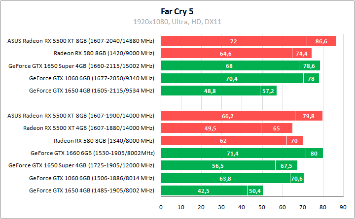 При активных HD-текстурах Far Cry 5 легко загружает до 6,5 ГБ видеопамяти, что серьезно бьет по позициям младшего варианта Radeon RX 5500 XT — разница с видеоадаптером на 8 ГБ достигает 22–33%. ASUS уверенно обходит всех соперников кроме GeForce GTX 1660, обойти последнего помогает разгон.