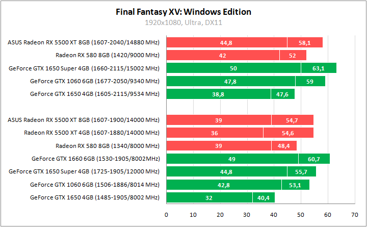 В Final Fantasy XV разница между двумя новичками небольшая, хотя игра тоже требует более 4 ГБ видеопамяти. Radeon RX 5500 XT ближе всего к GeForce GTX 1060, обгоняя Radeon RX 580 на 13% по среднему fps.