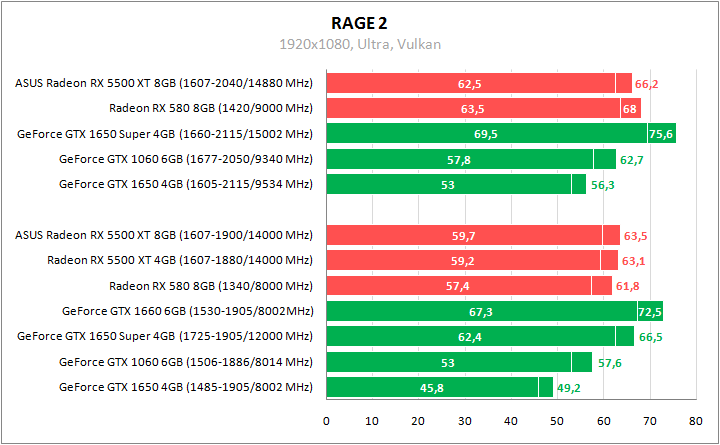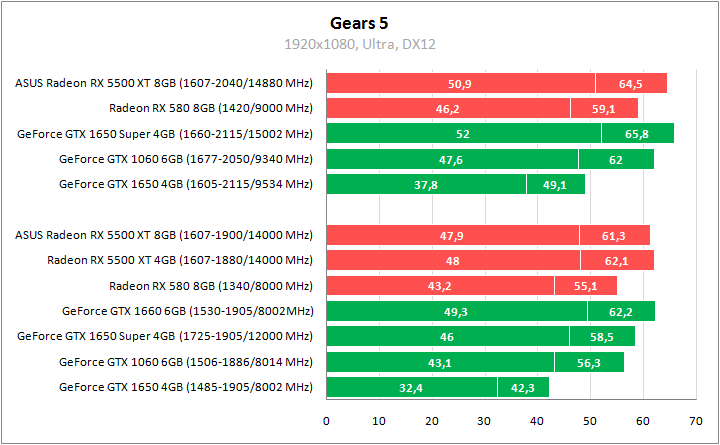 В отдельном обзоре «Игры против видеокарт» было отмечено, что Async Compute обеспечивает небольшое ускорение только для AMD. Поэтому тесты проведены в двух режимах. В оптимальном режиме Radeon RX 5500 XT показывает результаты на уровне GeForce GTX 1660, и даже без Async Compute наступает на пятки этому сопернику. Разгон ускоряет на 6%.