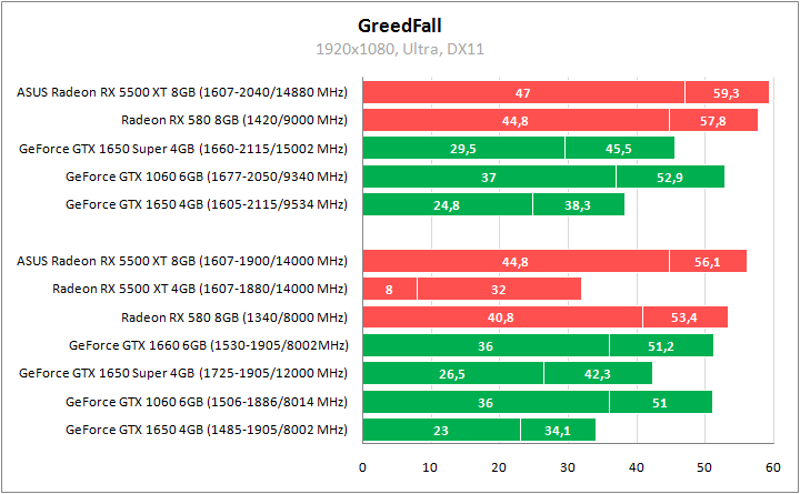 При максимальных установках графики GreedFall в тестовой сцене игра использует до 8 ГБ видеопамяти. Это приводит к натуральному слайд-шоу на Radeon RX 5500 XT с 4 ГБ, хотя GeForce GTX 1650 Super с таким же объемом памяти показывает более-менее приемлемый результат. У ASUS Radeon RX 5500 XT c 8 ГБ колоссальное преимущество над товарищем, будто это совершенно разные модели. И рассматриваемая видеокарта оказывается самой быстрой, легко обгоняя GeForce GTX 1660 даже при начальных частотах.