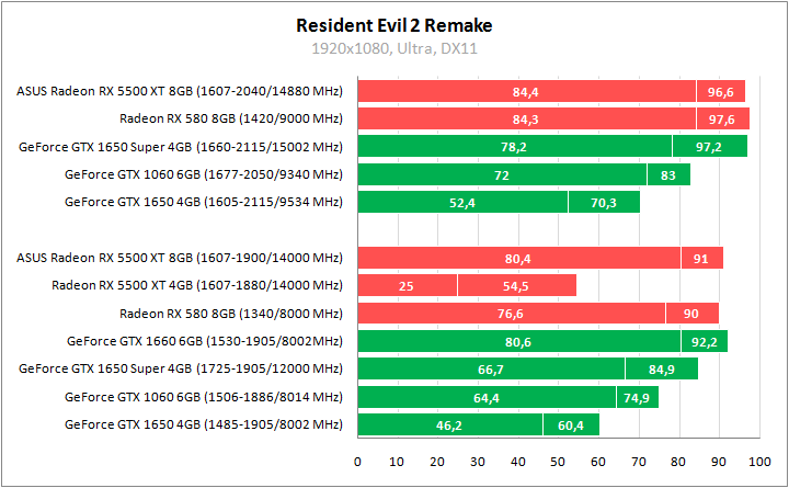 Младшая версия Radeon RX 5500 XT показывает полную несостоятельность в Resident Evil 2, из-за нестабильной производительности и лагов итоговый результат очень низкий. Зато ASUS Radeon RX 5500 XT 8GB уверенно конкурирует с GeForce GTX 1660 и Radeon RX 580. Загрузка видеопамяти в тестовой сцене достигает 6,4 ГБ.