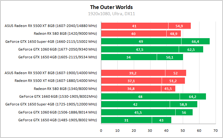The Outer Worlds использует до 4,6 ГБ видеопамяти в тестовой сцене, но разница между двумя Radeon RX 5500 XT небольшая. Новичок быстрее Radeon RX 580, но слабее GeForce GTX 1060 и GeForce GTX 1650 Super.