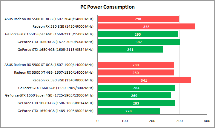Radeon RX 5500 XT потребляет меньше мощности в сравнении со старым Radeon RX, но немного выше некоторых решений NVIDIA.