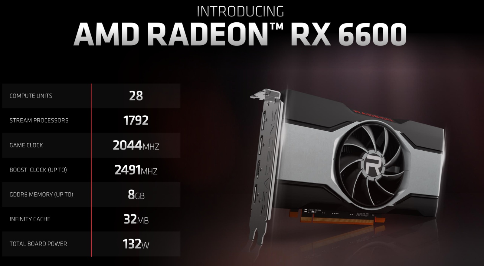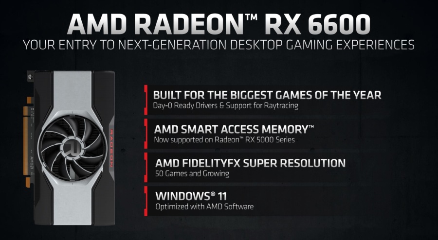 Radeon RX 6600 является полноценным представителем нового семейства графических решений AMD, поддерживая все преимущества архитектуры RDNA2. Графический чип обладает специальными аппаратными блоками для ускорения трассировки, поддерживает технологию прямого доступа к видеопамяти AMD Smart Access Memory и программные технологии AMD FidelityFX.