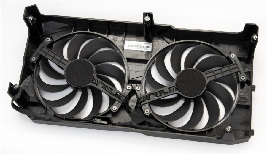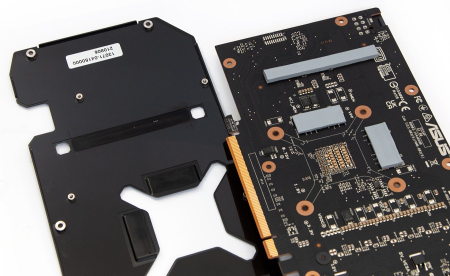 Посмотрим ближе на конструкцию охлаждения. Бэкплейт не только выполняет защитную функцию, но и отводит тепло от горячих зон платы через прокладки на текстолите.