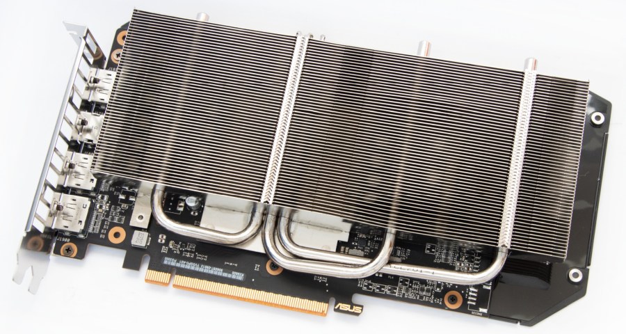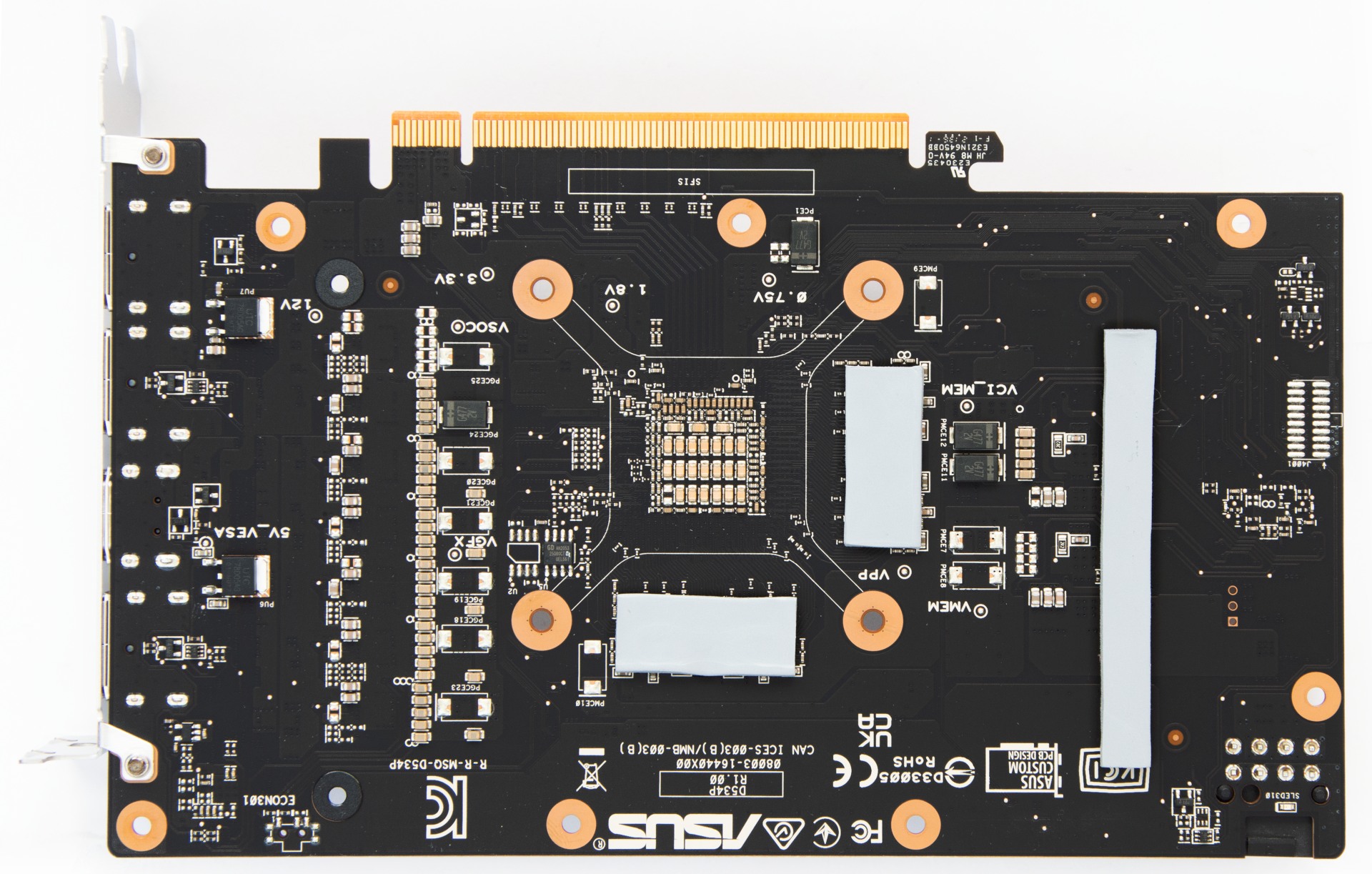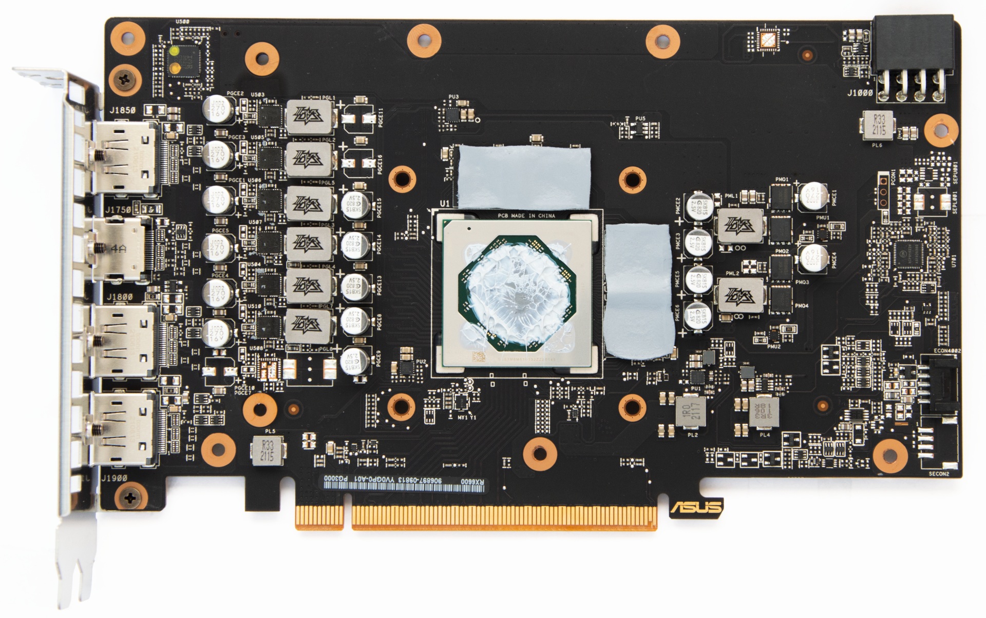 На боковой грани расположены логотипы ASUS и Radeon. Подсветка не предусмотрена. В углу один разъем питания на восемь контактов.