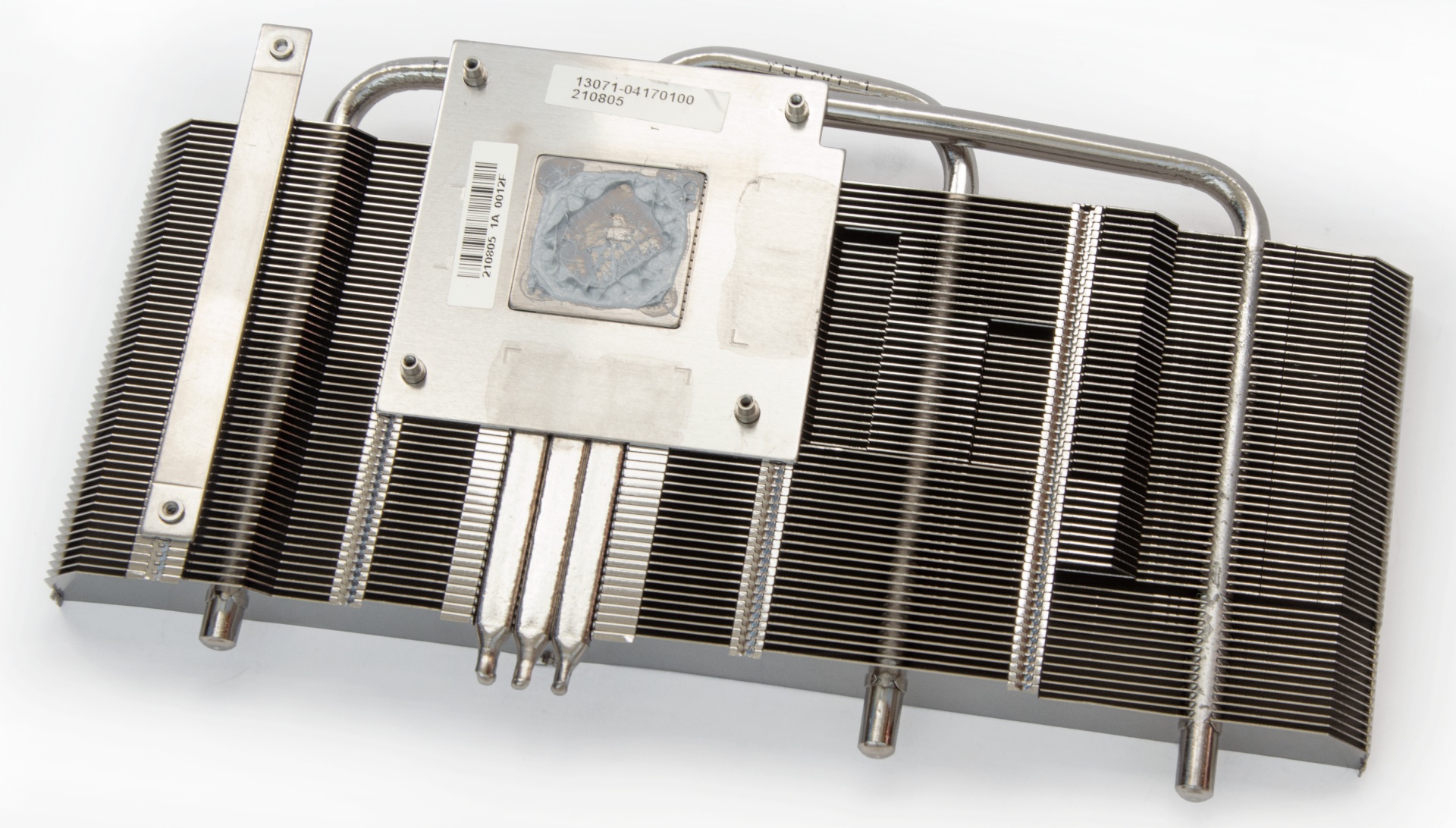 Радиатор идентичен тому, что используется в ASUS Dual RX 6600 XT, изменилось лишь расположение контактной площадки элементов VRM. Основание отводит тепло от GPU и микросхем памяти.