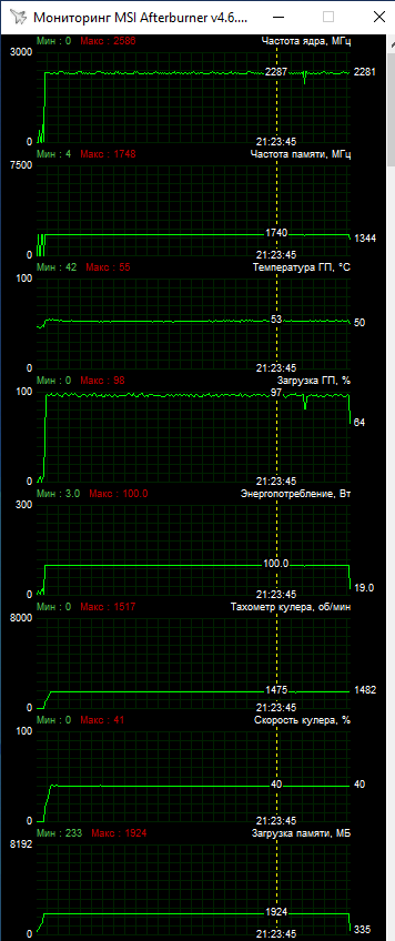 В игровом режиме частоты варьировались в диапазоне 2300–2400 МГц. В стресс-тесте 3DMark Time Spy около 2300 МГц и ниже, в некоторых играх до 2400–2470 МГц. Пиковая точка Boost 2584 МГц.