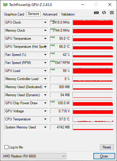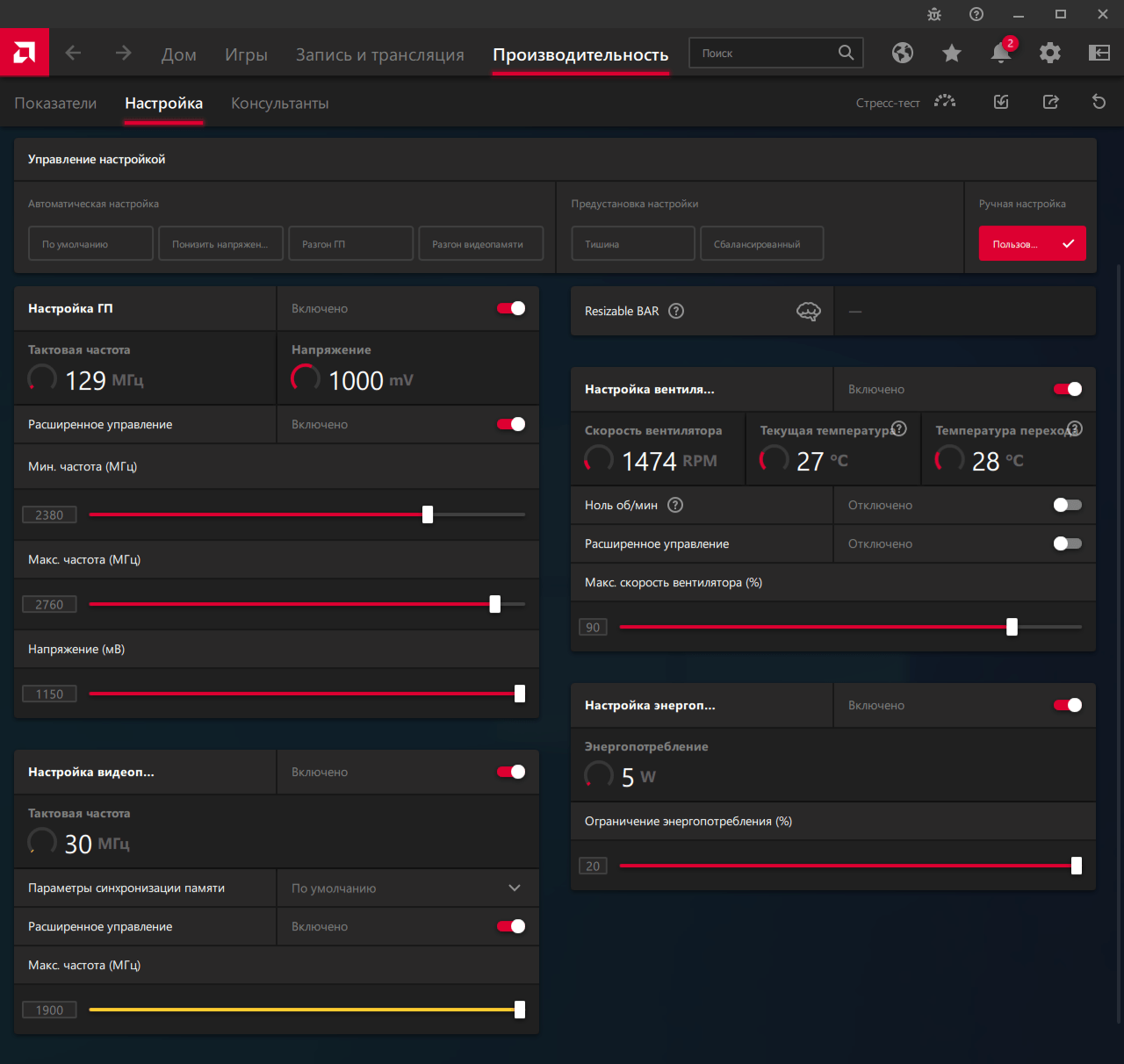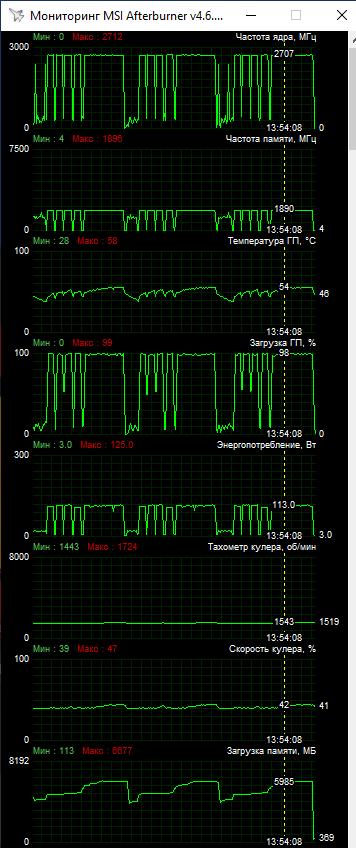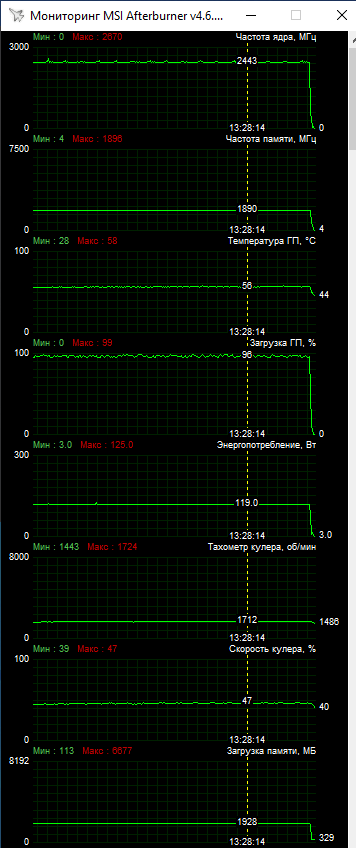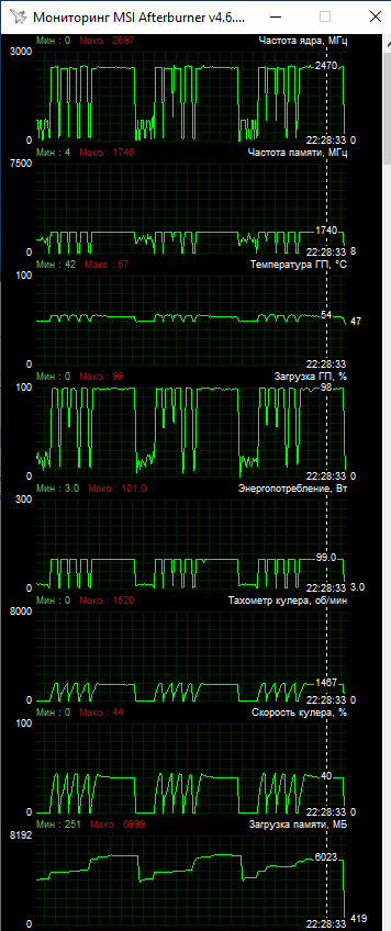 В стресс-тесте 3DMark Time Spy частоты подросли примерно до 2450, в Red Dead Redemption 2 и Horizon Zero Dawn до 2700 МГц. Вентиляторы работали в автоматическом режиме, удерживая температуру процессора в рамках 58 °C при скорости около 1700 об/мин, что является великолепным результатом.