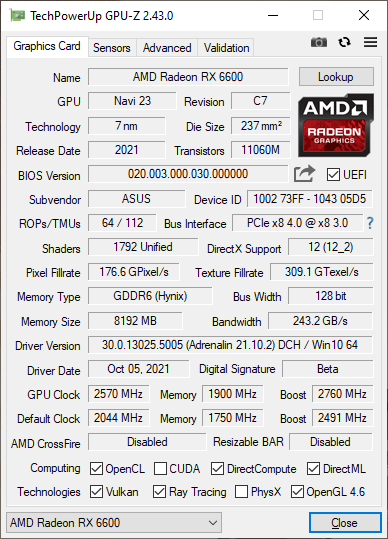 Базовая частота повышена до 2380 МГц при Game Clock 2570 МГц и Boost Clock до 2760 МГц. Параметры близки разгонным показателям ASUS Dual RX 6600 XT, но реальные частоты в Boost-режиме ниже. Память ускорена до 1900 (15200 МГц).
