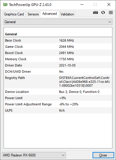 Базовая частота GPU установлена на уровне 1626 МГц, Game Clock — 2044 МГц, Boost Clock — 2491 МГц. Шина памяти 128 бит, установлено восемь гигабайт GDDR6. Эффективная частота памяти эквивалентна значению 14000 МГц (у RX 6600 XT это 16000 МГц). Такие упрощения позволили снизить TDP видеокарты до скромных 132 Вт.