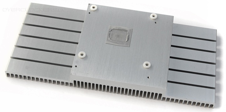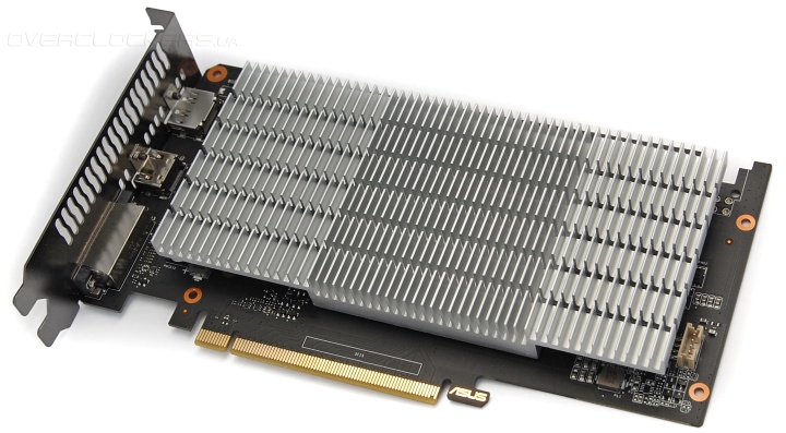 Радиатор из алюминия, в конструкции не используются тепловые трубки. Все простовато, но при TDP в 75 Вт такого охлаждения вполне достаточно. Тем более что габариты у радиатор приличные, а за обдув отвечает сразу два вентилятора. Благодаря наличию прорезей в радиаторе частично обдувается и вся плата с элементами на ней.