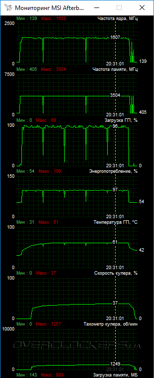 Реальная частота ядра оказалась ближе к уровню 1600 МГц, с отклонениями, как в большую, так и в меньшую сторону. И примерно такие же частоты мы наблюдали у ASUS EX-GTX1050TI-4G. При эксплуатации на открытом стенде с температурой внутри помещения около 23 °C ядро видеокарты грелось лишь до 61 °C. Вентиляторы при этом раскручивались до 1250 об/мин. Все это проиллюстрировано ниже на скриншотах мониторинга параметров во время прохождения бенчмарков Metro: last Light и Tom Clancy's The Division.