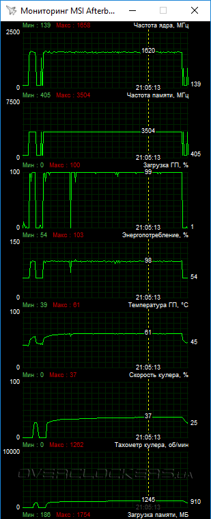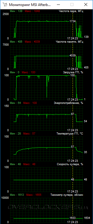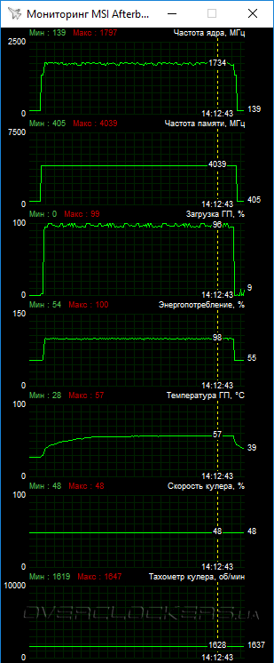 Средняя частота Boost держалась выше 1700 МГц, то есть эффективный прирост по частоте ядра около 100 МГц. Память смогла работать без сбоев на частоте 8078 (4039) МГц.