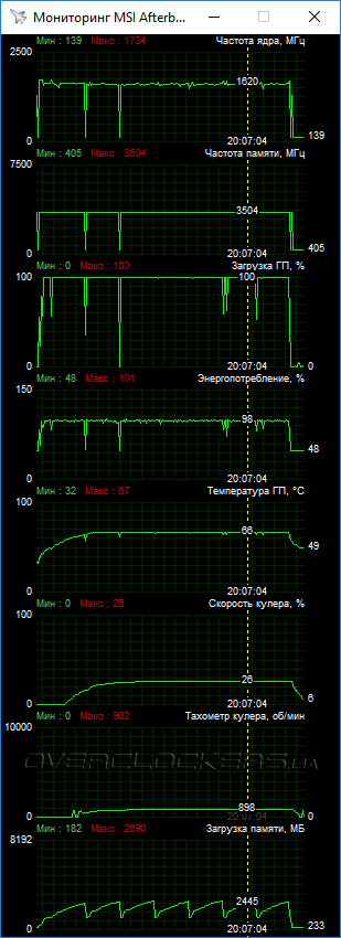 Новый техпроцесс и опыт разгона старших Pascal дает надежды на хороший потенциал карты. Однако на ASUS мы столкнулись с ограничением по максимальным частотам и с зафиксированным лимитом мощности. Память нельзя разогнать свыше 8 ГГц. А у графического чипа ограничение по максимальному Boost около 1911 МГц. Причем этот максимум в 1911 МГц сохраняется в широком диапазоне изменения базовой частоты. Вы можете повышать ее на 200 или 300 МГц, а максимум не меняется, но падает стабильность из-за повышения минимального уровня частот. После экспериментов мы остановились на базовом значении в 1471 МГц при максимуме 1911 МГц. Итоговая частота памяти составила 8008 МГц.