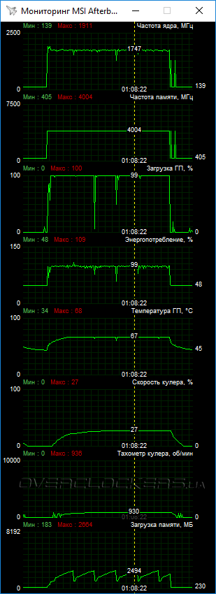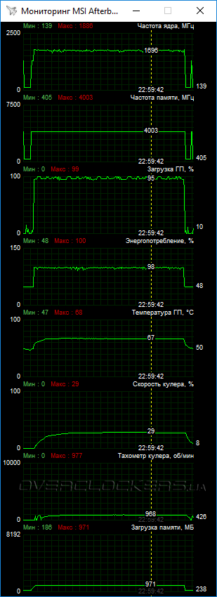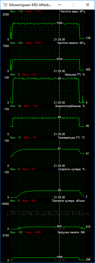 Тестирование проходило на открытом стенде при температуре внутри помещения 22–23 °C. В таких условиях ядро карты грелось до 67–68 °C при скорости вращения вентиляторов около 900 об/мин, т.е. шум был минимальный. Ниже это проиллюстрировано скриншотами мониторинга параметров в тестах Tom Clancy's The Division и Metro: last Light.