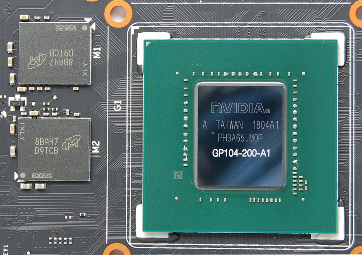 Серия GeForce GTX 1070 использует GPU GP104-200-A1 с 1920 активными потоковыми процессорами. Восемь гигабайт памяти набрано микросхемами GDDR5 от Micron с маркировкой 8BA47 D9TCB.