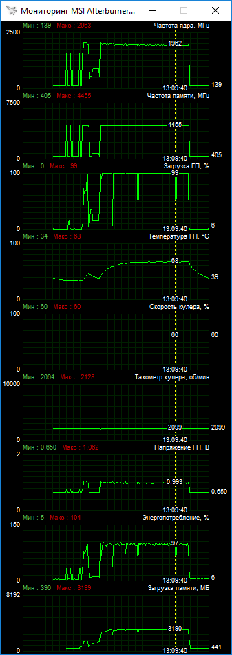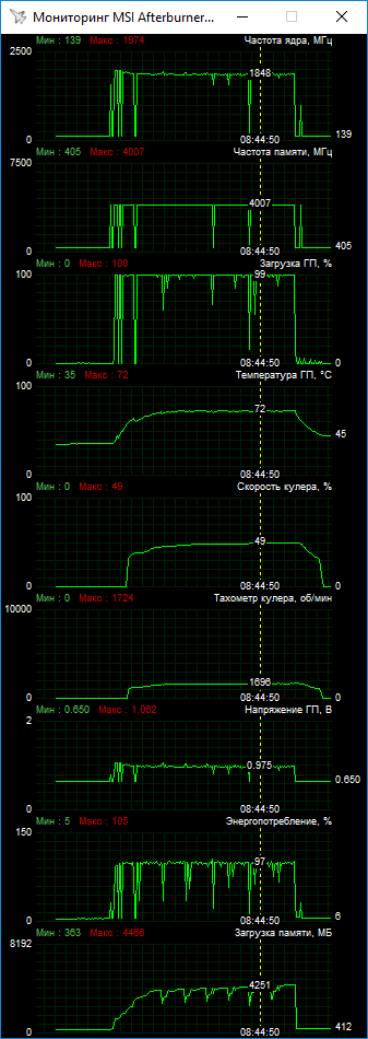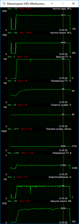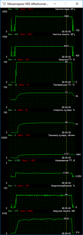 По приведенным графикам мониторинга параметров видно, что ASUS Expedition в номинале превышает лимит мощности, показывая значения выше 100%. При этом повысить этот лимит можно лишь на 12%. Тут нет большого явного запаса по мощности, что позволило бы стабилизировать Boost в максимальных значениях. Поэтому при разгоне вариативность частот сохраняется, хотя общий их уровень растет. В ходе наших испытаний мы остановились на базовом значении 1682 МГц при пиковом Boost до 2063 МГц.