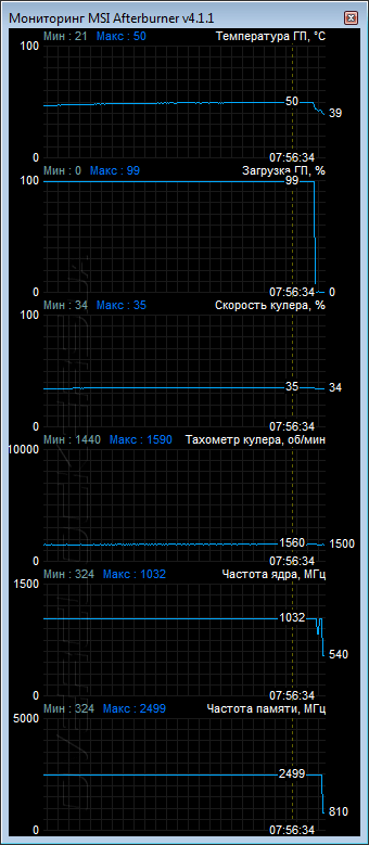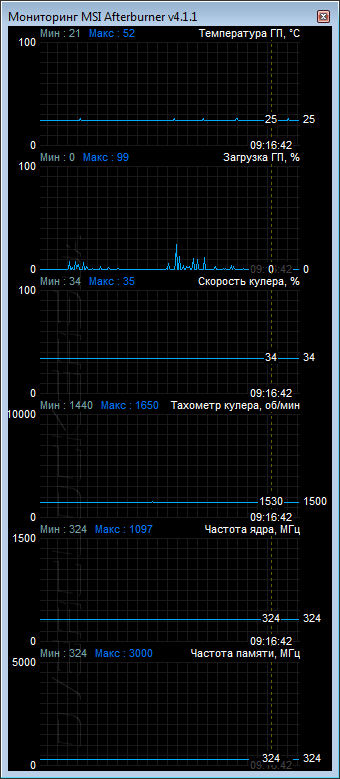 Несмотря на свою компактность, штатная система охлаждения отлично справляется с поставленной перед ней задачей. В игровых приложениях нам не удалось прогреть ядро выше 50 °C (при 20 °C в помещении). Скорость вращения вентилятора в среднем составила 1500–1550 об/мин и оставалась неизменной при разных уровнях нагрузки. Уровень шума можно описать как минимальный.