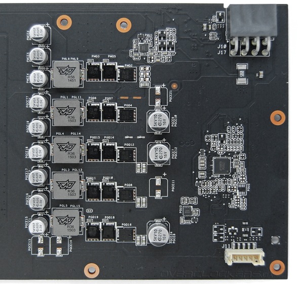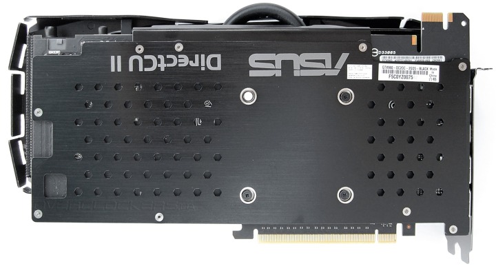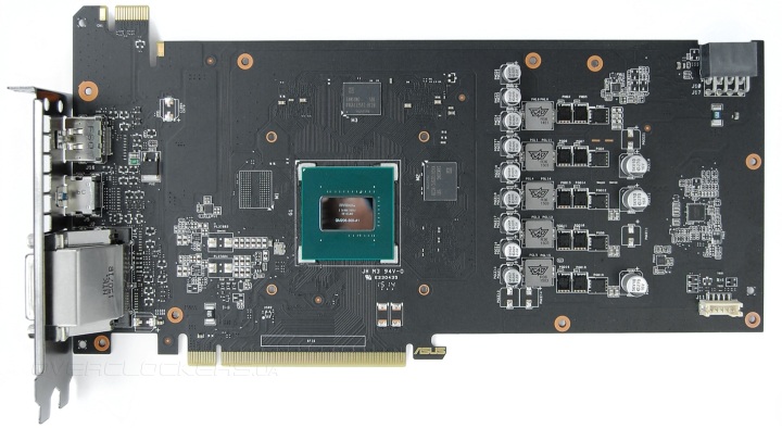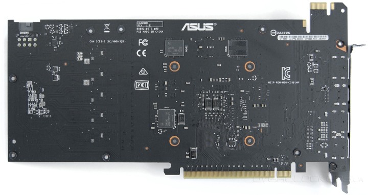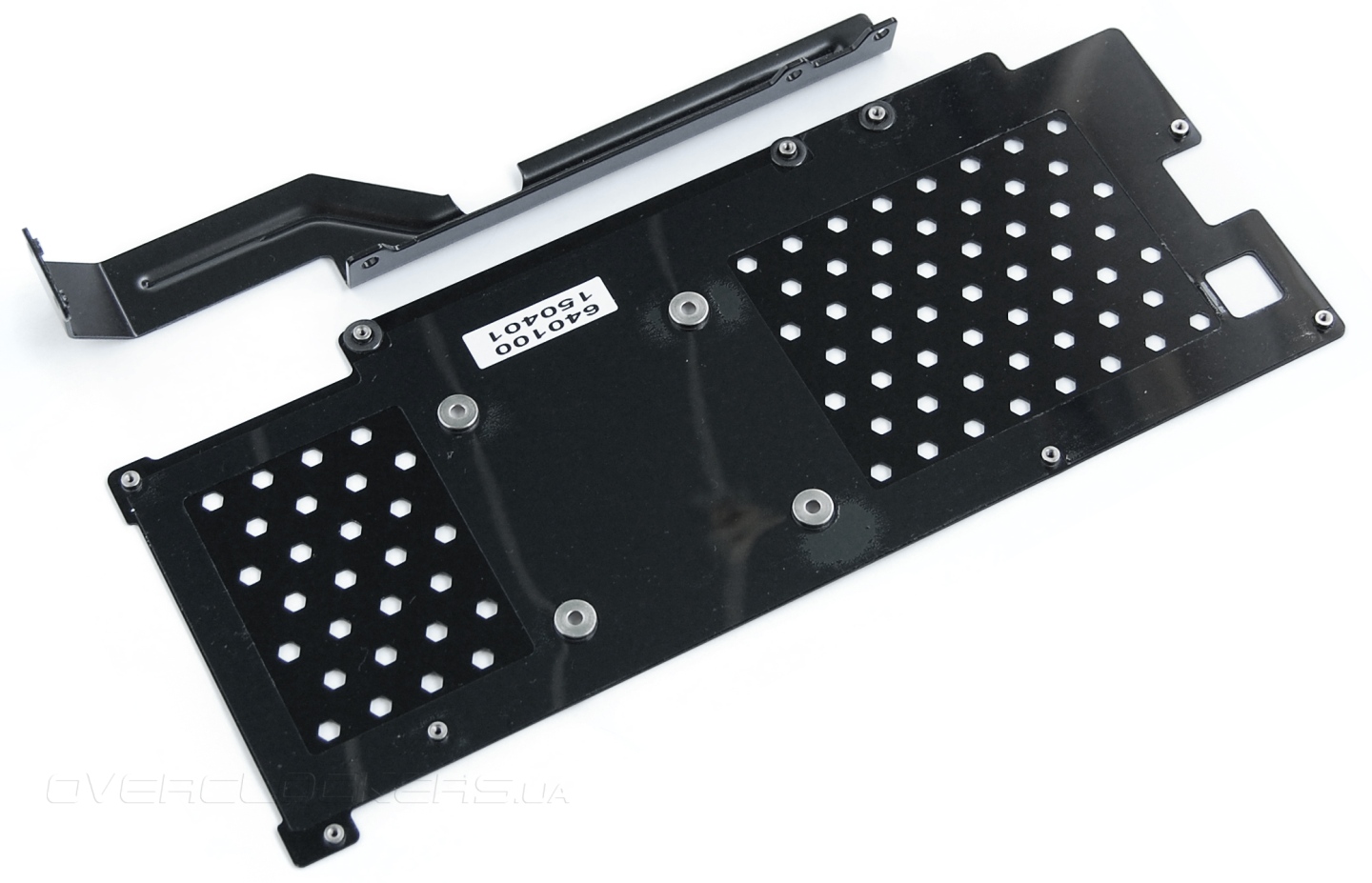 Задняя сторона накрыта перфорированной металлической пластиной. На выдающейся боковой площадке размещен разъем для SLI.