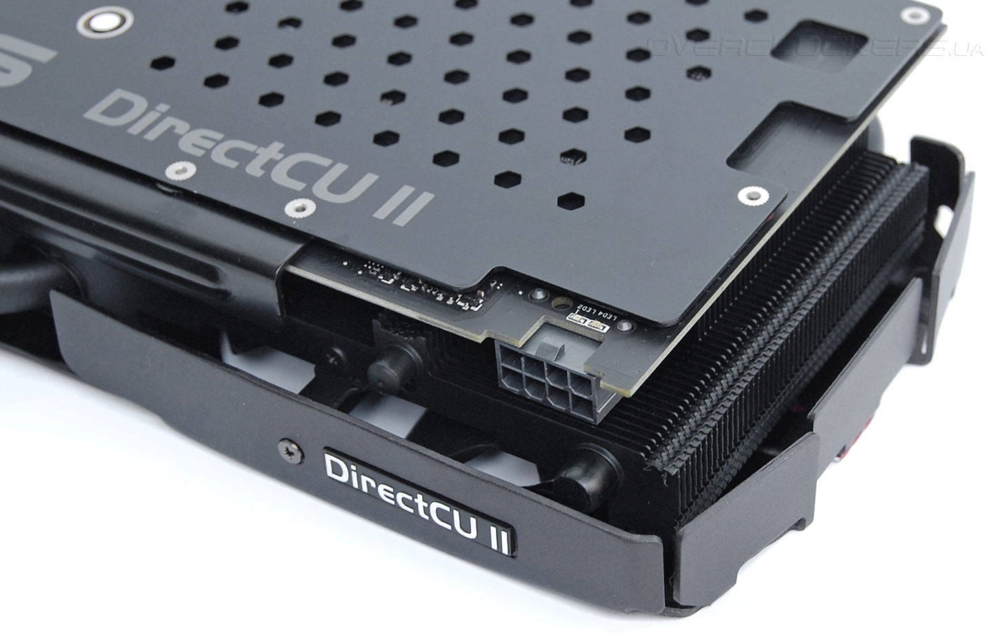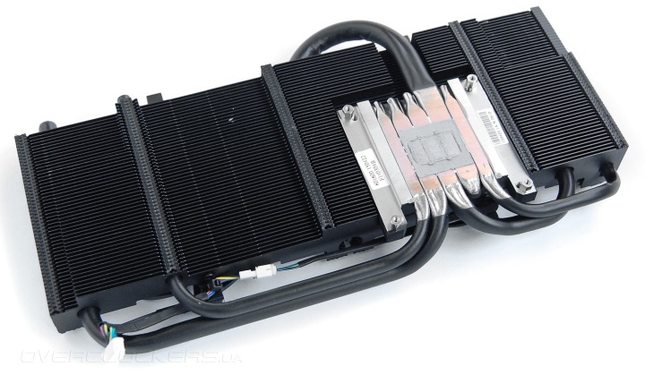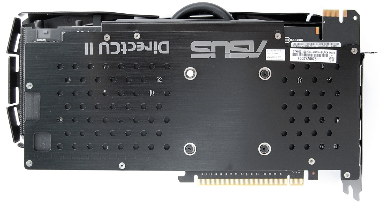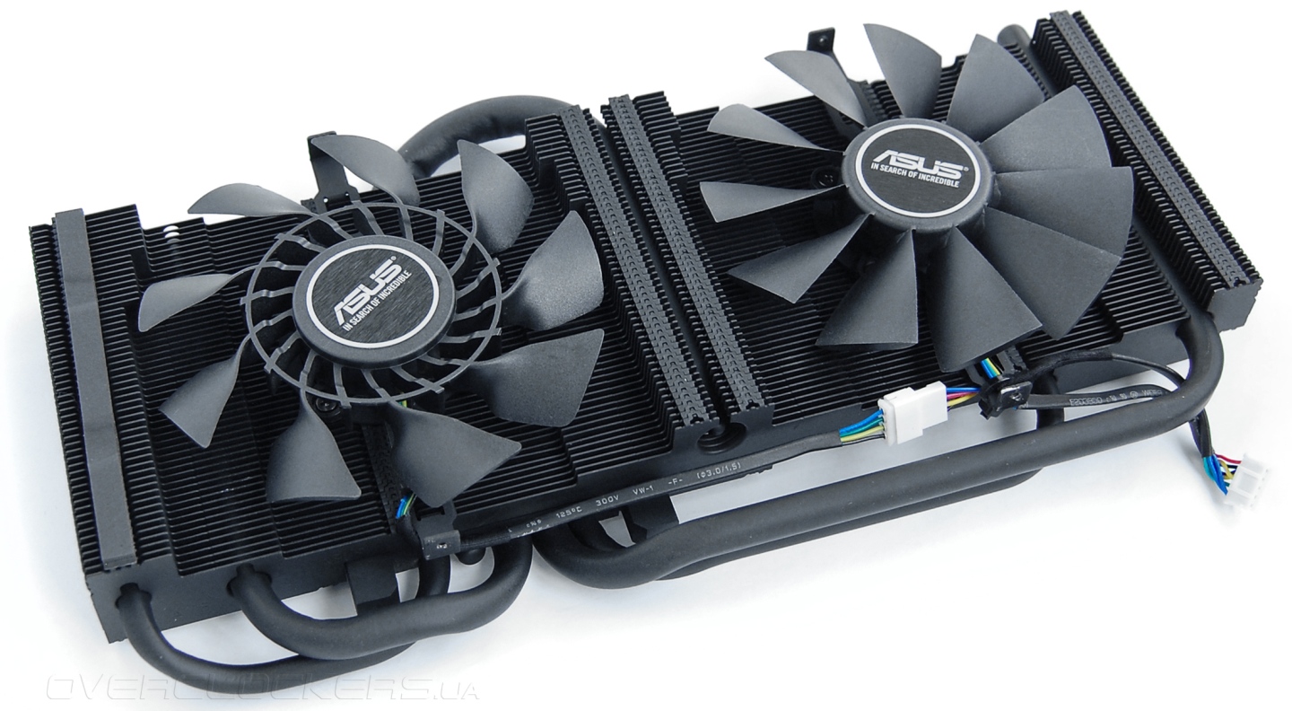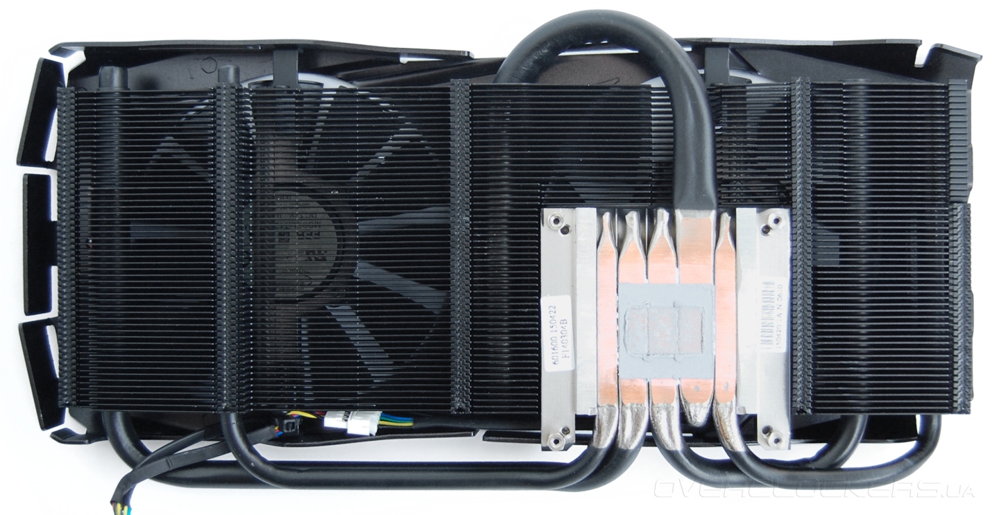 Система охлаждения внушительная. Под кожухом скрывается большой радиатор c пятью тепловыми трубками. Причем одна из трубок рекордного диаметра 10 мм. По габаритам и конструкции кулер копирует охлаждение топовой видеокарты ASUS MATRIX-GTX980-P-4GD5, что само по себе звучит, как лучший комплимент для рассматриваемой модели.