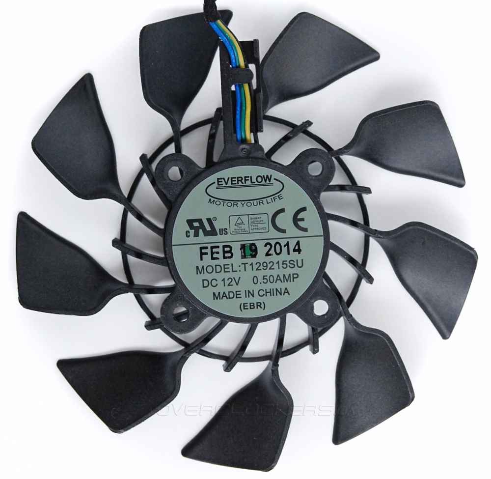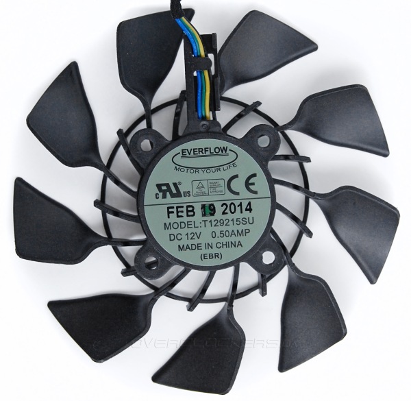 Оба вентилятора диаметром 100 мм, но разной формы. В правой части видеокарты расположен вентилятор классической конструкции, а в левой части гибридная модель, напоминающая одновременно осевые и радиальные версии. Лопасти по внешней окружности создают нисходящих поток, а «лопатки» внутри кольца прогоняют воздух через боковые секции. Такой вентилятор частично обеспечивает и выдув воздуха за пределы корпуса через вентиляционные отверстия на задней панели.