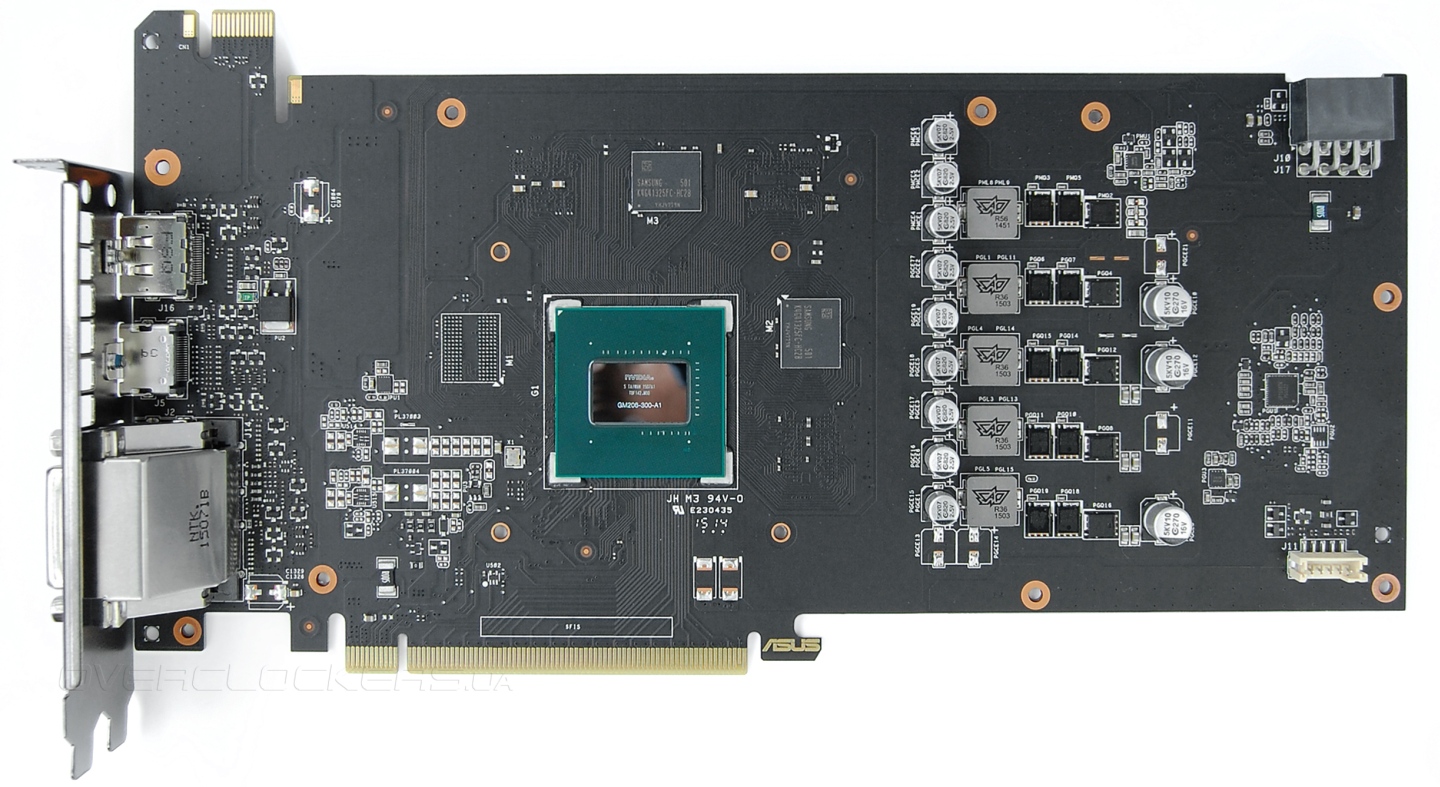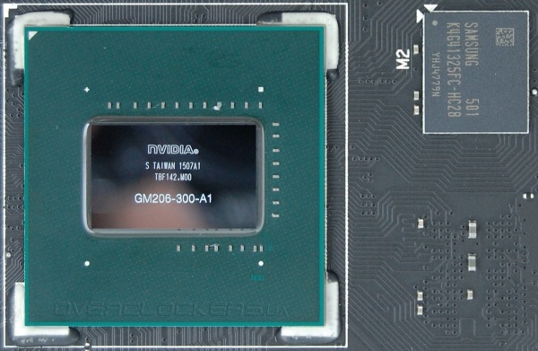 Кристалл GM206-300-A1 расположен на подложке без защитной рамки. Два гигабайта памяти набраны четырьмя чипами Samsung K4G41325FC-HC28.