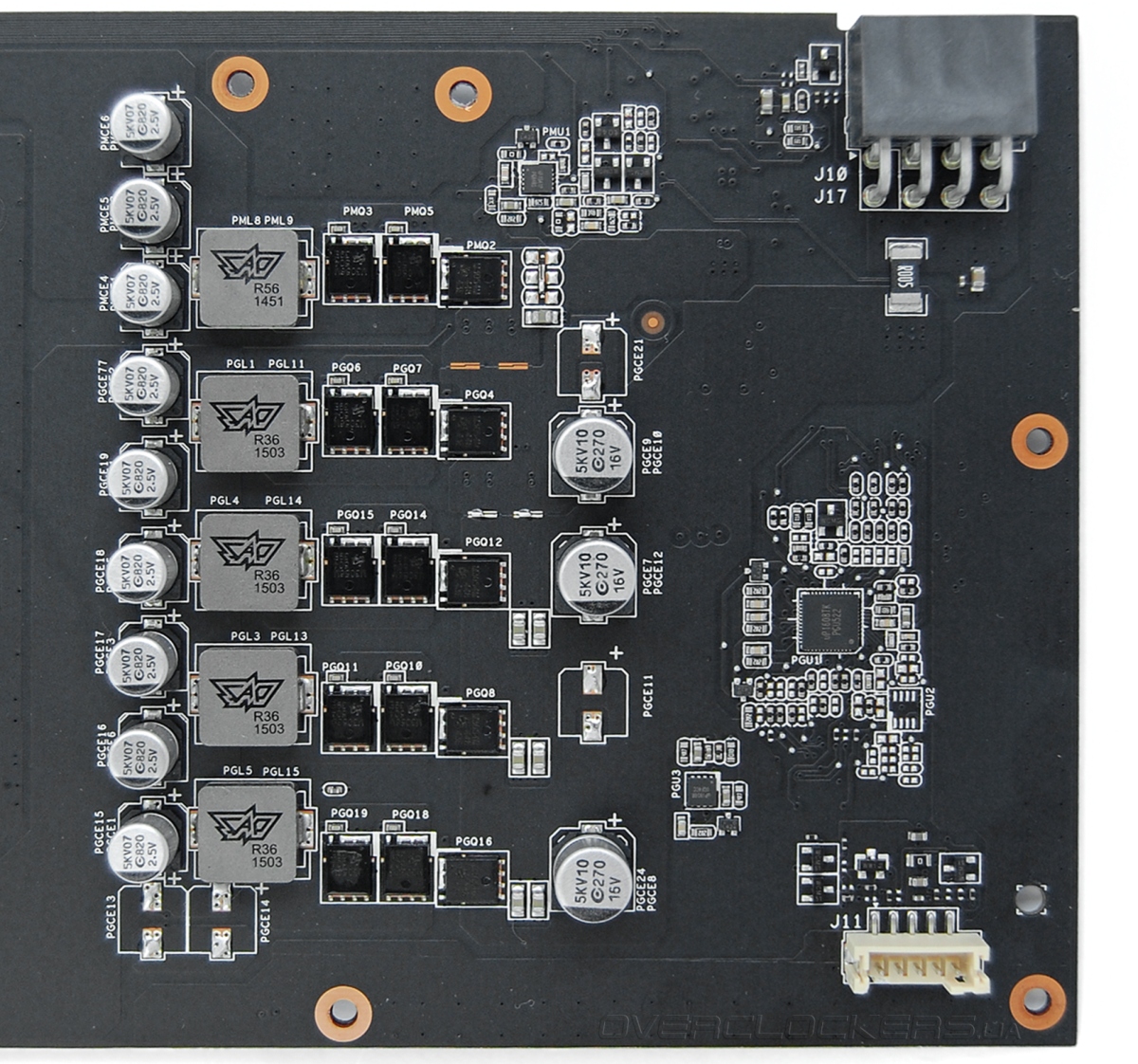 В углу размещается один восьмиконтактный разъем питания, развернутый защелкой вверх. Такое положение упрощает подключение соответствующего кабеля и не требует делать вырез в радиаторе под разъемом.