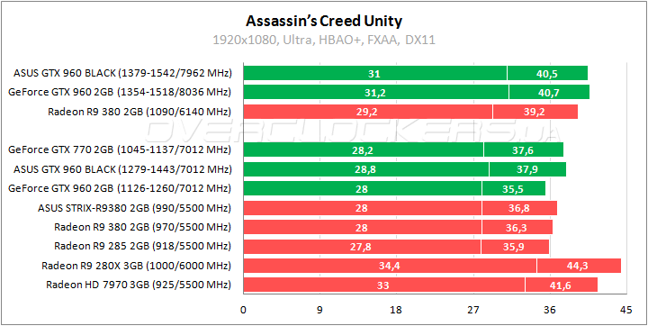 В Assassin’s Creed все видеокарты с 2 ГБ показывают близкие результаты. Но все равно стоит отметить небольшое преимущество ASUS Black Edition относительно конкурентов Radeon R9 285/380 и GeForce GTX 770. В разгоне отрыв от Radeon R9 380 только усиливается. Более высокая частота ядра не дает преимуществ относительно другой разогнанной версии GeForce GTX 960 с быстрой памятью.