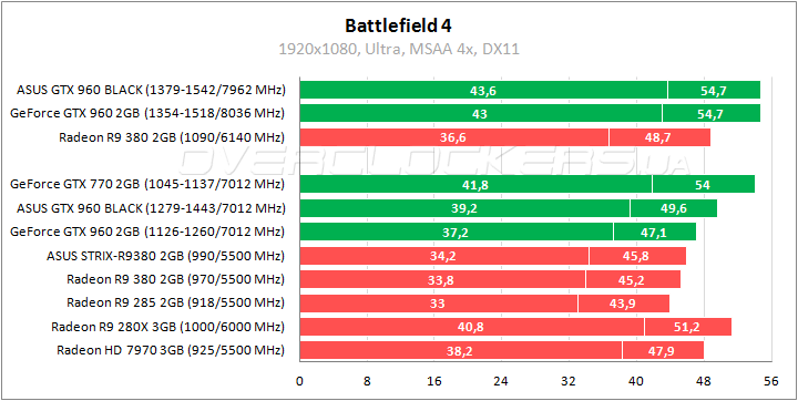 Около 5% выигрывает ASUS относительно референса в Battlefield 4. При этом герой обзора демонстрирует уверенный отрыв от 256-битных соперников AMD и даже немного обходит старого флагмана Radeon HD 7970 с 384-битной шиной. Разгон придает ускорение в 10–11%, позволяя обогнать GeForce GTX 770 и другую форсированную версию GeForce GTX 960 с более высокой частотой GDDR5.