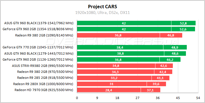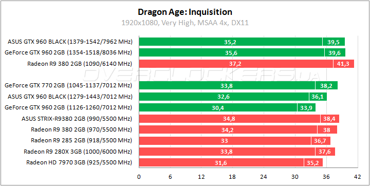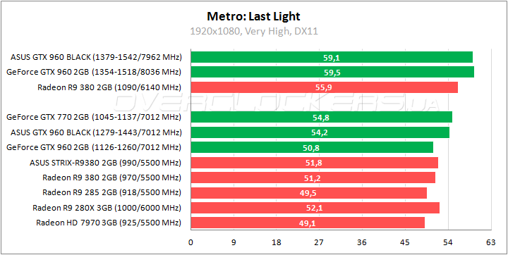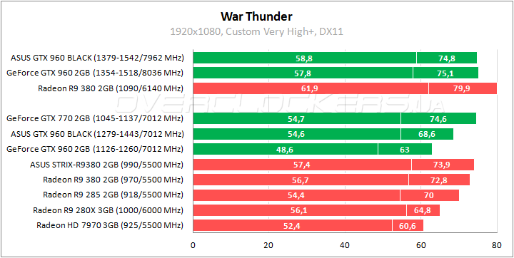ASUS выигрывает до 7% относительно референсной версии GeForce GTX 960 и уступает лишь 4–5% более мощному GeForce GTX 770. В номинале удается обойти Radeon HD 7970 при минимальном отставании от Radeon R9 285. Прирост при разгоне на уровне 9%.