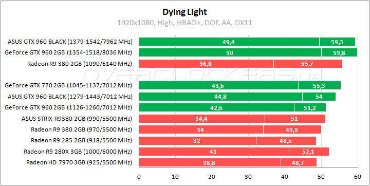 Немногим более 5% выигрывает герой обзора у референса в Dying Light. По минимальному fps он оказывается лучше всех участников, а по среднеигровому показателю незначительно уступает GeForce GTX 770. Видеоадаптер хорошо реагирует на повышение частоты памяти, увеличивая свои результаты при разгоне на 9–11%.