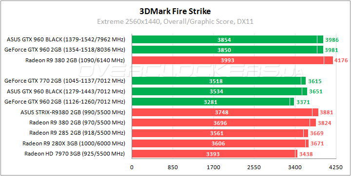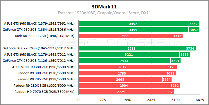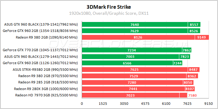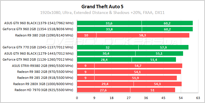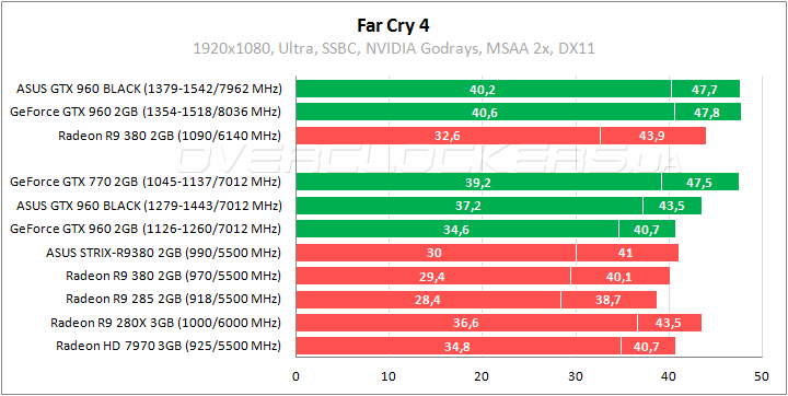 Заводской разгон обеспечивает преимущество в 10% относительно обычной версии GeForce GTX 960 и отставание 5% от GeForce GTX 770. Radeon R9 380 слабее почти на 16%, Radeon R9 280X проигрывает 11%.