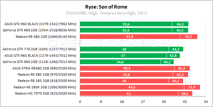 Расстановка сил кардинально меняется в Ryse. Вперед выходят видеокарты AMD. ASUS GTX960-DC2OC-2GD5-BLACK дышит в спину GeForce GTX 770, а при разгоне лишь нагоняет Radeon R9 380 с заводскими частотами.