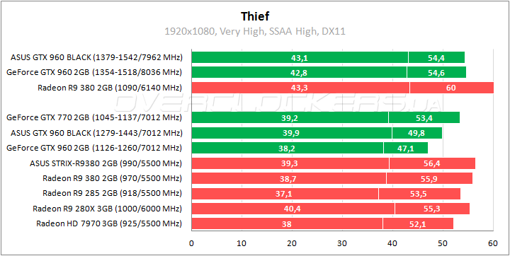 В Thief по минимальному fps рассматриваемый ASUS незначительно выигрывает у Radeon R9 380, существенно уступая по среднему показателю. В активе конкурента AMD еще имеется поддержка Mantle, которая обеспечивает дополнительный выигрыш в быстродействии. Разгон позволяет ускорить ASUS на 8–9%.
