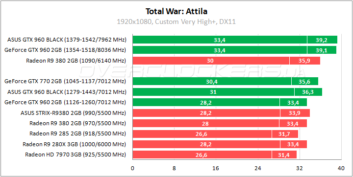 До 10% разницы между референсом и ASUS в Attila. Заводской разгон изначально обеспечивает ASUS самые высокие показатели в этой самой красивой современной стратегии. Отрыв от Radeon R9 380 на уровне 7–11%. Radeon R9 280X проигрывает 9-10%. Разгон позволяет повысит результаты еще на 8%.