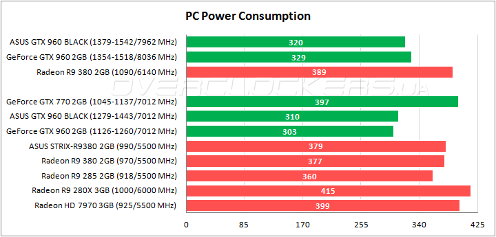 По экономичности GeForce GTX 960 вне конкуренции. В разгоне ASUS потребляет меньше напарника по серии, что связано с отсутствием софтвольтмода.